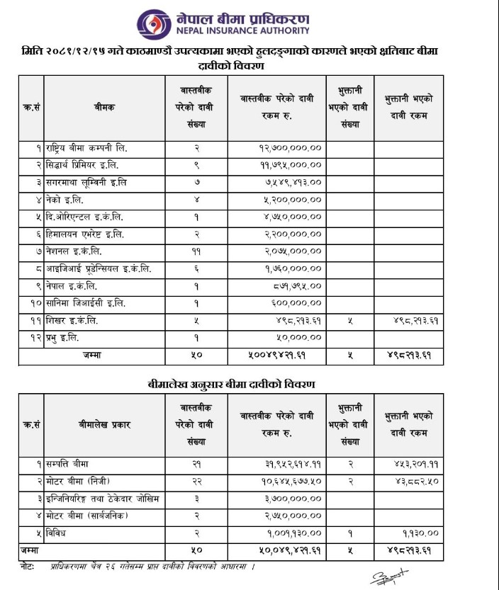 अन्य कम्पनीहरुले बीमा दावी भुक्तानी प्रक्रिया भने सुरु गरिसकेका छन् ।