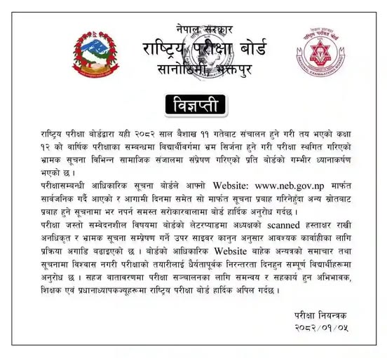 यसअघि केही सामाजिक सञ्जालहरूमा कक्षा १२ को परीक्षा वैशाखपछि सारिएको भन्ने सूचना भाइरल भएको थियो, जसले अभिभावक र विद्यार्थीहरूमा अन्योलता सिर्जना गरेको थियो । बोर्डले यस्तो भ्रामक प्रचारप्रति गम्भीर ध्यानाकर्षण भएको भनेको छ ।