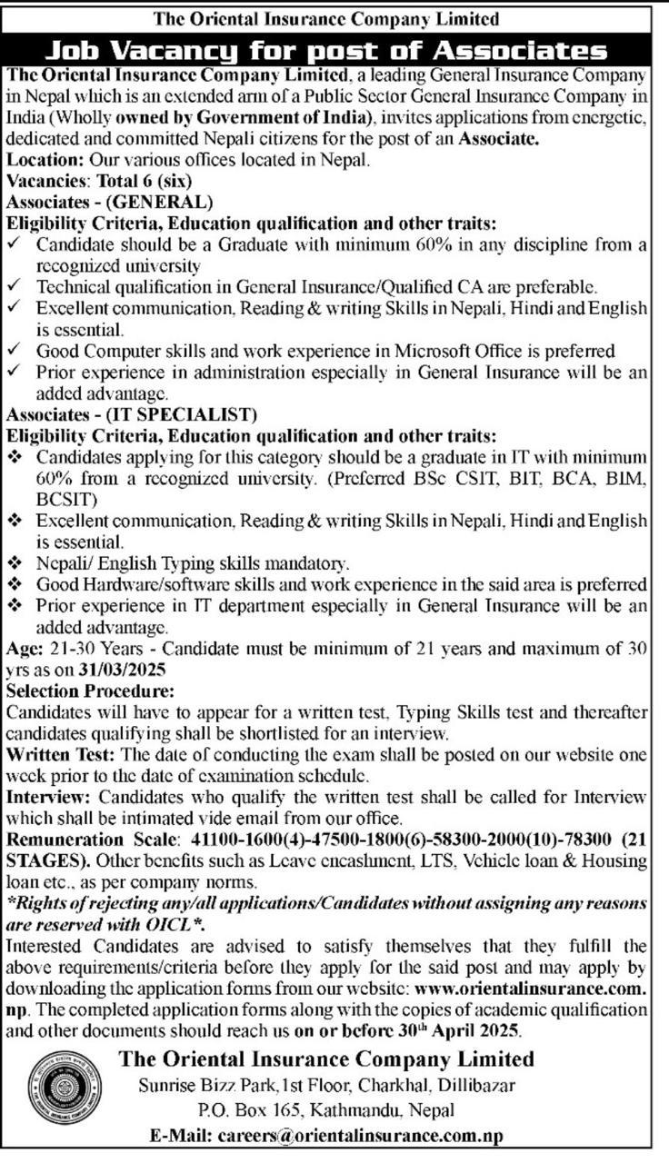 काठमाडौं । ओरिएण्टल इन्स्योरेन्स विभिन्न पदका लागि रोजगारी खुलाएको छ । कम्पनीले देशभरका शाखा कार्यालयहरुका लागि कर्मचारी माग गरेको हो ।