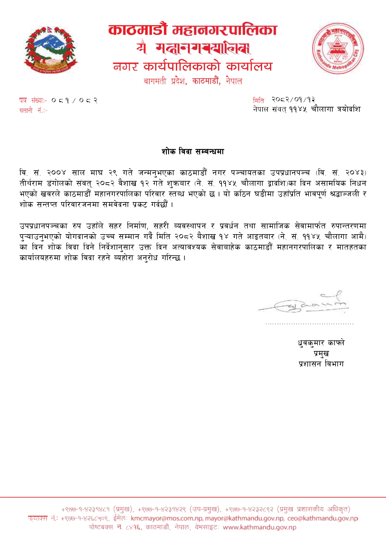काठमाडौं । काठमाडौं महानगरपालिकाले आज पञ्चायतकालका पूर्वउपप्रमुख तीर्थराम डंगोलको निधनमा शोक बिदा दिएको छ।