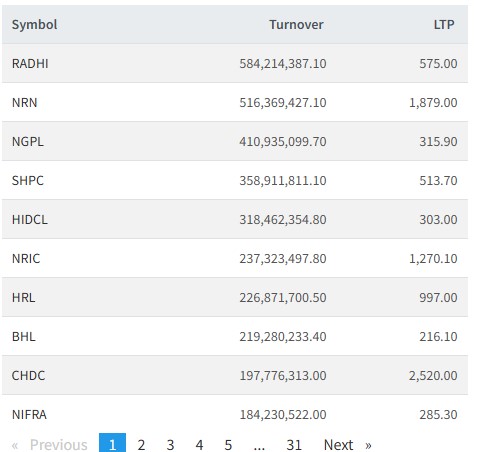 त्यस्तै, एनआरएन इन्फ्रास्टक्चर, रादी जलविधुत्, हिमालयन डिष्टलरी, अरुण भ्याली, युनिभर्सल पावर, सानिमा माई, निफ्रा र हिमालयन रि को सर्वाधिक कारोबार भएको छ।