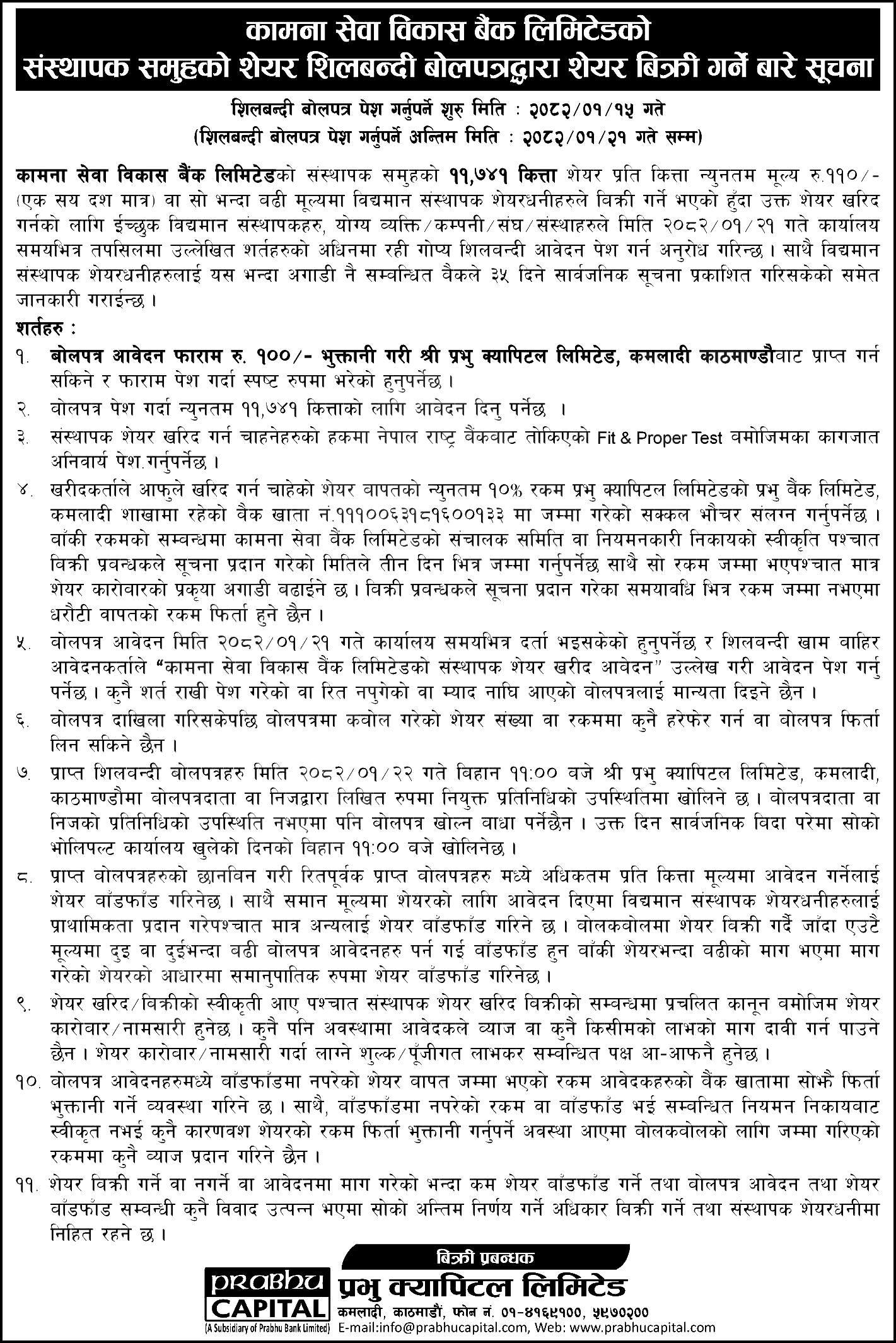 काठमाडौं । कामना सेवा विकास बैंक लिमिटेडले ११ हजार ७४१ कित्ता संस्थापक शेयर लिलाम प्रक्रिया मार्फत् सबैले किन्न पाउने गरी बिक्रीमा राखेको छ।
