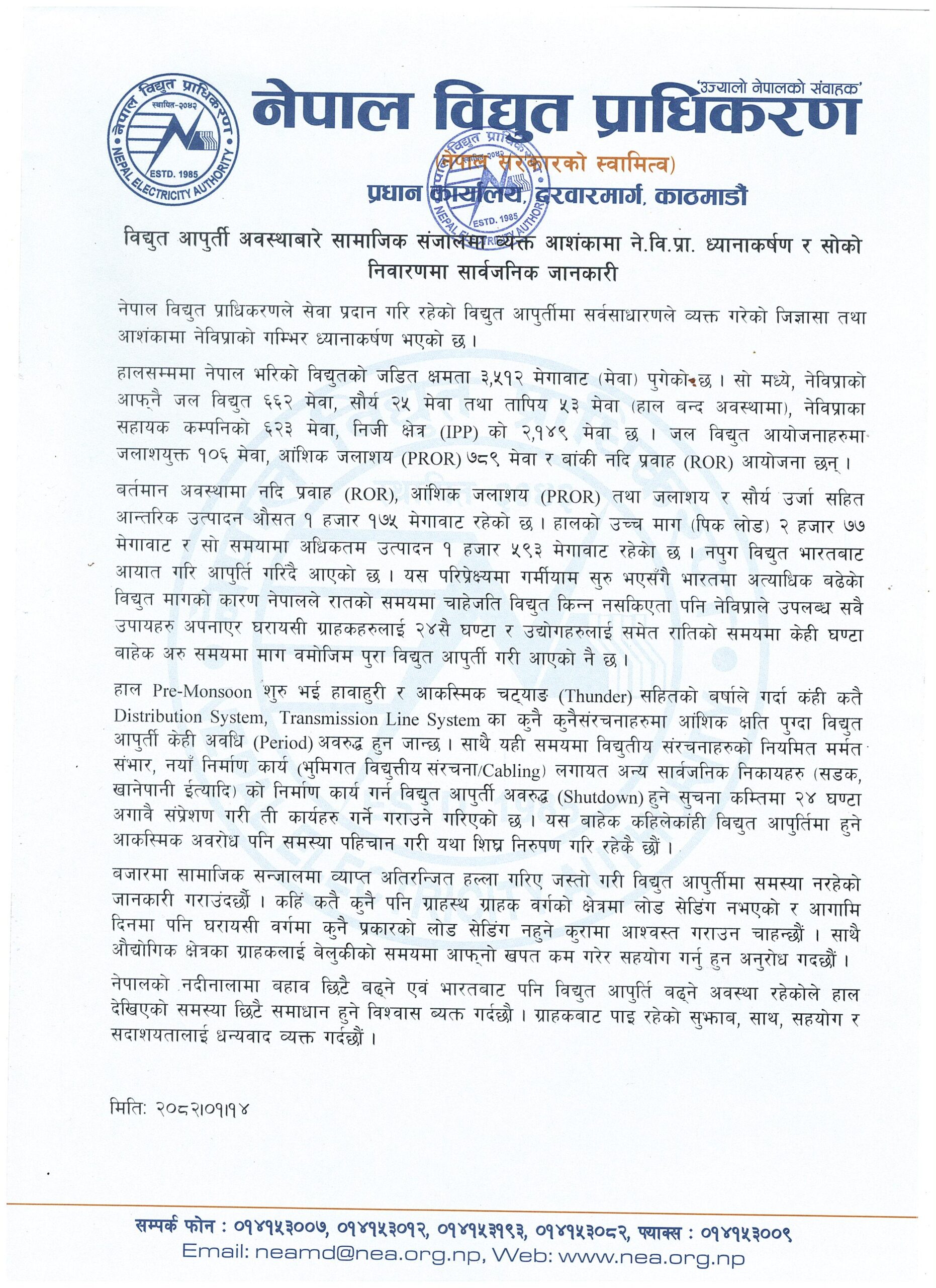 प्राधिकरणले सामाजिक सञ्जालमा देखिएको अतिरञ्जित र भ्रामक सूचनाप्रति खण्डन गर्दै हाल देशभर विद्युत् आपूर्ति नियमित रुपमा भइरहेको र आगामी दिनमा पनि घरायसी ग्राहकका लागि चौबिसै घण्टा विद्युत् आपूर्ति सुनिश्चित गरिने जानकारी दिएको छ। साथै, औद्योगिक क्षेत्रका ग्राहकलाई विशेष गरी बेलुकाको समयमा विद्युत् खपत कम गरेर सहकार्य गर्न पनि प्राधिकरणले अनुरोध गरेको छ।