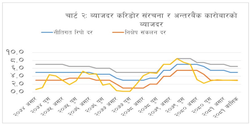 ब्याजदर करिडोर संरचना कार्यान्वयनमा ल्याइएपश्चात् स्थायी तरलता सुविधाको कारण अन्तरबैंक कारोबारको ब्याजदर करिडोरको माथिल्लो सीमा कायम हुन सकेको देखिन्छ । तर खुला बजार कारोबारबाट तरलता प्रशोचन पर्याप्त हुन नसक्नुका साथै स्थायी निक्षेप सुविधाको व्यवस्था नभएकाले २०८० माघसम्म करिडोरको तल्लो सीमा कायम हुन सकेन । फलस्वरूपः बैंक तथा वित्तीय संस्थाहरूको अन्तर बैंक कारोबारको ब्याजदरमा उत्तार–चढाव कायम रह्यो। उदाहरणका लागि २०७४ असारमा अन्तरबैंक कारोबारको भारित औसत ब्याजदर ०.६ प्रतिशत रहेकोमा त्यसपछिको ६ महिनाको अवधिमा ४.४ प्रतिशत पुगेको देखिन्छ (चार्ट २) । त्यसै गरी, २०७७ पुसमा अन्तरबैंक कारोबारको ब्याजदर ०.२ प्रतिशत रहेकोमा २०७९ असोजमा आइपुग्दा ८.५ प्रतिशतसम्म पुगेको देखिन्छ ।