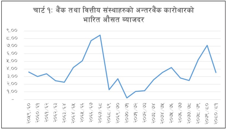 नेपाल राष्ट्र बैंक ऐन, २०५८ कार्यान्वयनमा आएपश्चात् तरलता व्व्यवस्थापनमा गरिएका उपरोक्त सुधारहरूका बाबजुद बैंक तथा वित्तीय संस्थाहरूको अन्तरबैंक कारोबारको ब्याजदरमा अपेक्षित स्थायित्व कायम हुन सकेन (चार्ट १) । यसको प्रभाव निक्षेप र कर्जाको ब्याजदर पनि देखिएको छ ।