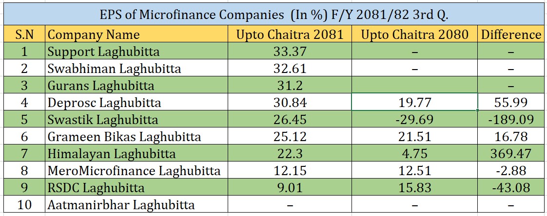 चालु आवको नौ महिनामा स्वाभिमान लघुवित्तको ३२.६१ प्रतिशत, गुराँस लघुवित्तको ३१.२० प्रतिशत, डिप्रोक्स लघुवित्तको ३०.८४ प्रतिशत, स्वस्तिक लघुवित्तको २६.४५ प्रतिशत, ग्रामिण विकास लघुवित्तको २५.१२ प्रतिशत, हिमालयन लघुवित्तको २२ प्रतिशत प्रतिशेयर आम्दानी रहेको छ ।