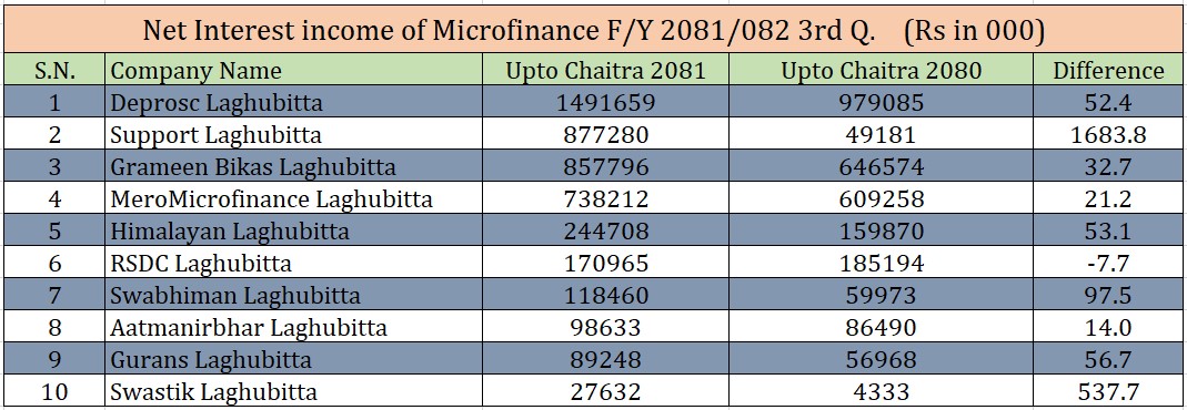 समीक्षा अवधिसम्मको वित्तीय विवरण सार्वजनिक गरेका लघुवित्तहरुमध्ये नौ वटाको खुद ब्याज आम्दानी बृद्धि भएको छ । लघुवित्तहरुको मूख्य आम्दानीको स्रोतमा खुद ब्याज आम्दानी रहेको हुन्छ । यस अवधिमा डिप्रोक्स लघुवित्तको ब्याज आम्दानी सबैभन्दा बढी रहेको छ । कम्पनीले चालु आर्थिक वर्षको नौ महिनामा एक अर्ब ४९ करोड १६ लाख रुपैयाँ ब्याज आम्दानी गरेको छ । गत आवको सोही अवधिको तुलनामा लघुवित्तको सो आम्दानी ५२ प्रतिशतले बृद्धि भएको हो ।