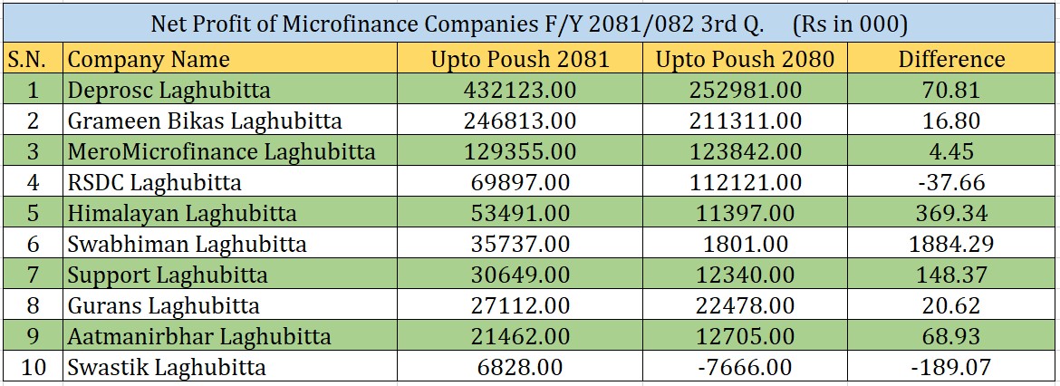 हाल नेपाल स्टक एक्चसेञ्ज (नेप्से) मा सूचीकृत भएका एक दर्जन लघुवित्त कम्पनीहरुले चालु आवको चैत मसान्तसम्मको अपरिष्कृत वित्तीय विवरण सार्वजनिक गरीसकेका छन् । समीक्षा अवधिमा विवरण सार्वजनिक गरेका ८ वटा लघुवित्तको मुनाफा गत आवको अवधिमा बढेको छ भने दुई वटाको मात्र समान्य अंकले घट्न पुगेको छ ।