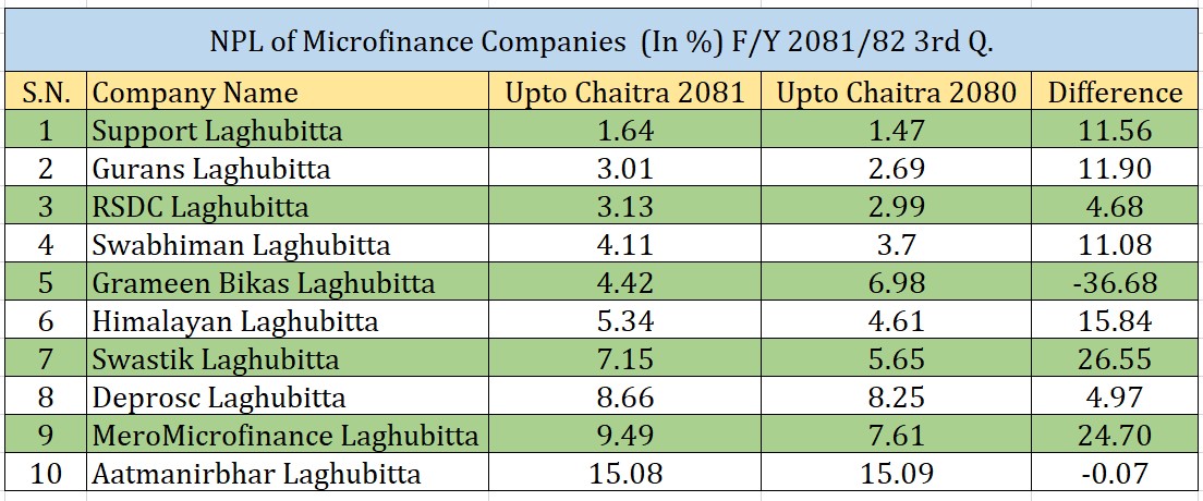 साथै, गुराँस लघुवित्तको ३.०१ प्रतिशत, आरएसडिसी लघुवित्तको ३.१३ प्रतिशत, स्वाभिमान लघुवित्तको ४.११ प्रतिशत, ग्रामिण विकास लघुवित्तको ४.४२ प्रतिशत, हिमालयन लघुवित्तको ५.३४ प्रतिशत, स्वस्तिक लघुवित्तको ७.१५ प्रतिशत, डिप्रोक्स लघुवित्तको ८.६६ प्रतिशत खराब कर्जा रहेको छ । दोस्रो बजारमा सबैभन्दाबढी शेयरमूल्य रहेको आत्मनिर्भर लघुवित्तको खराब कर्जा १५ प्रतिशतले सर्वाधिक रहेको छ ।