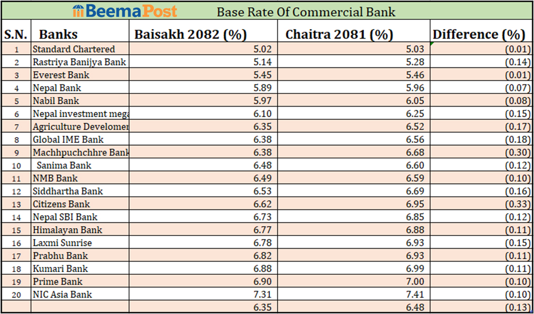 यता, राष्ट्रिय वाणिज्य बैंकको ५.१४ प्रतिशत, एभरेष्ट बैंकको ५.४५ प्रतिशत, नेपाल बैंकको ५.८९ प्रतिशत, नबिल बैंकको ५.९७ प्रतिशत आधार दर रहेको छ ।
