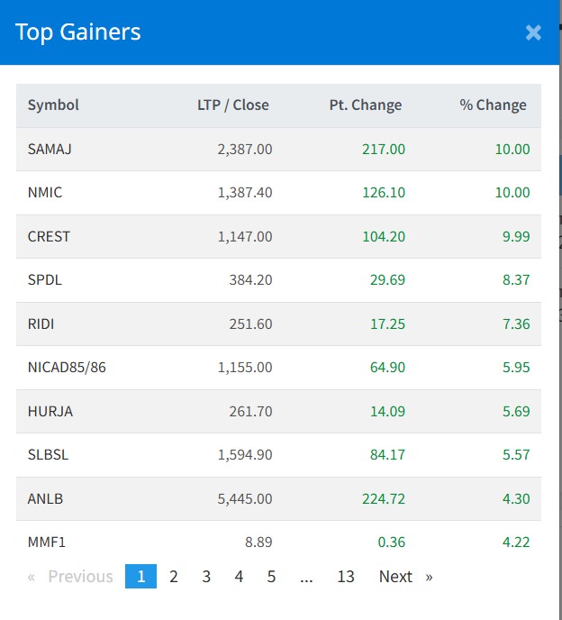आज समाज लघुवित्त, नेपाल माइक्रो इन्स्योरेन्स र क्रेष्ट माइक्रो लाइफ इन्स्योरेन्स लगायतका कम्पनीको शेयरमूल्यमा सकारात्मक सर्किट लागेको छ । यसदिन सिनर्जी पावर डेभलपमेन्ट र रिदि पावर कम्पनीको शेयरमूल्य बृद्धि भएको छ ।