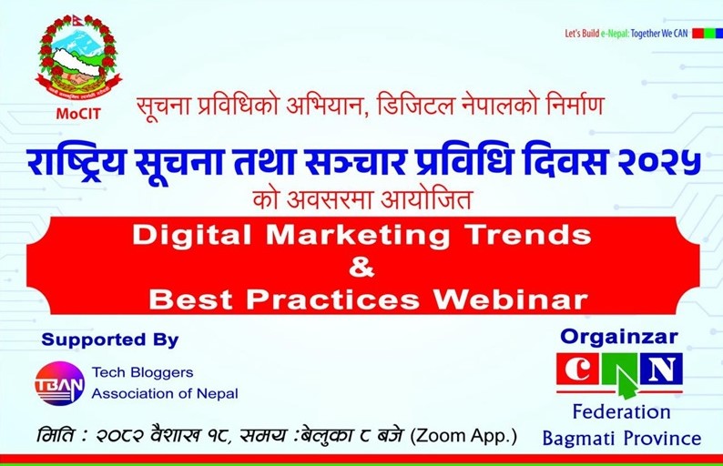 “Digital Marketing Trends & Best Practices” शीर्षकको यो वेबिनार २०७८ वैशाख १८ गते बेलुका ८ बजे जुममार्फत सञ्चालन हुनेछ। यस कार्यक्रमको मुख्य उद्देश्य व्यवसायी, बजार विज्ञ र सूचना तथा सञ्चार प्रविधि (आईसीटी) क्षेत्रका पेशेवरहरूलाई डिजिटल मार्केटिङका पछिल्ला प्रचलन र प्रभावकारी रणनीतिहरूबारे जानकारी गराउनु हो।