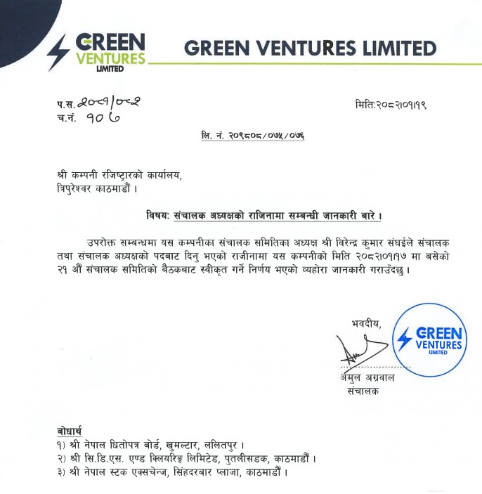 ग्रीन भेन्चर्सका अध्यक्ष विरेन्द्र कुमार संघईद्वारा राजिनामा