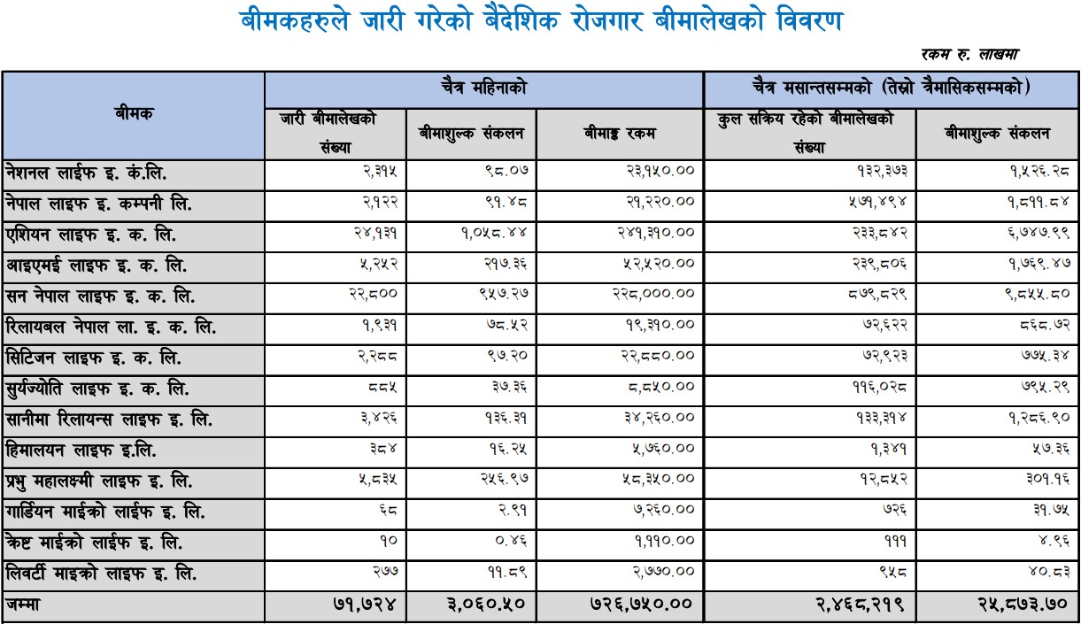 माइक्रो सहितका १४ वटा जीवन बीमा कम्पनीहरूले चालू आर्थिक वर्षको शुरूदेखि चैत मसान्तसम्म (९ महीना) वैदेशिक रोजगार बीमालेखबाट २ अर्ब ५८ करोड ७३ लाख रुपैयाँ बीमाशुल्क संकलन गरेका छन्।