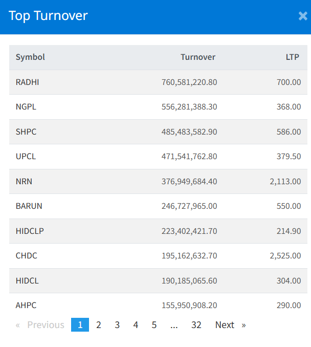 ङादी पावरको ५५ करोड ६२ लाख रुपैयाँ, सानिमा माइ हाइड्रोपावरको ४८ करोड ५४ लाख रुपैयाँ, युनिभर्सल पावर कम्पनीको ४७ करोड १५ लाख रुपैयाँले सर्वाधिक कारोबार भएको छ ।