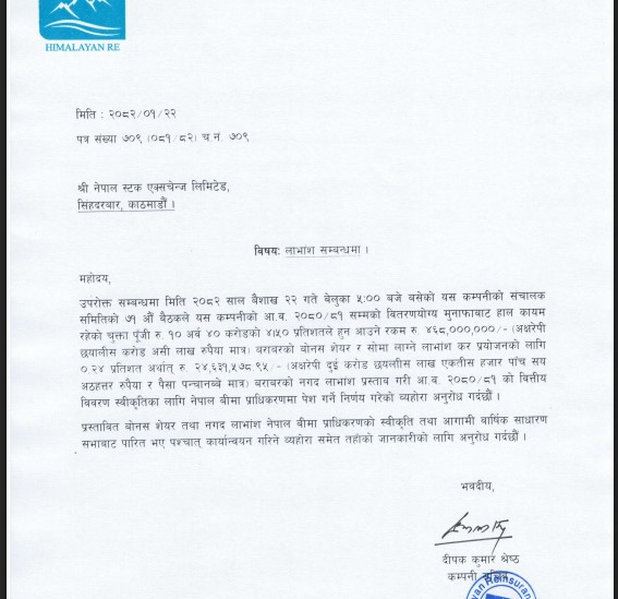 हिमालयन रिइन्स्योरेन्सद्वारा लाभांश घोषणा, बोनस र नगद कति ?