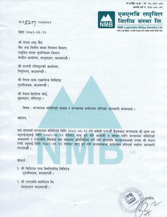 त्यस्तै, संस्थापक सञ्चालकमा रोशन रेग्मी र स्वतन्त्र सञ्चालकमा हरि गोपाल अधिकारी नियुक्त भएका छन् । कम्पनी सञ्चालक समितिको बैशाख २२ गते बसेको बैठकको निर्णयले अध्यक्ष, सञ्चालक र स्वतन्त्र सञ्चालक नियुक्त गरेको हो ।