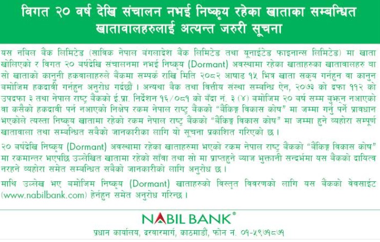 नविल बैंक (साविक नेपाल बंगलादेश बैंक र यूनाईटेड फाइनान्स)मा खाता खोलिएका र विगत २० बर्षदेखि संचालनमा नभई निष्क्रिय अवस्थामा रहेका खातावाल वा कानुनी हकवालाले असार १५ गतेभित्र खाता सक्रिय गराउन समेत आग्रह गरेको छ ।