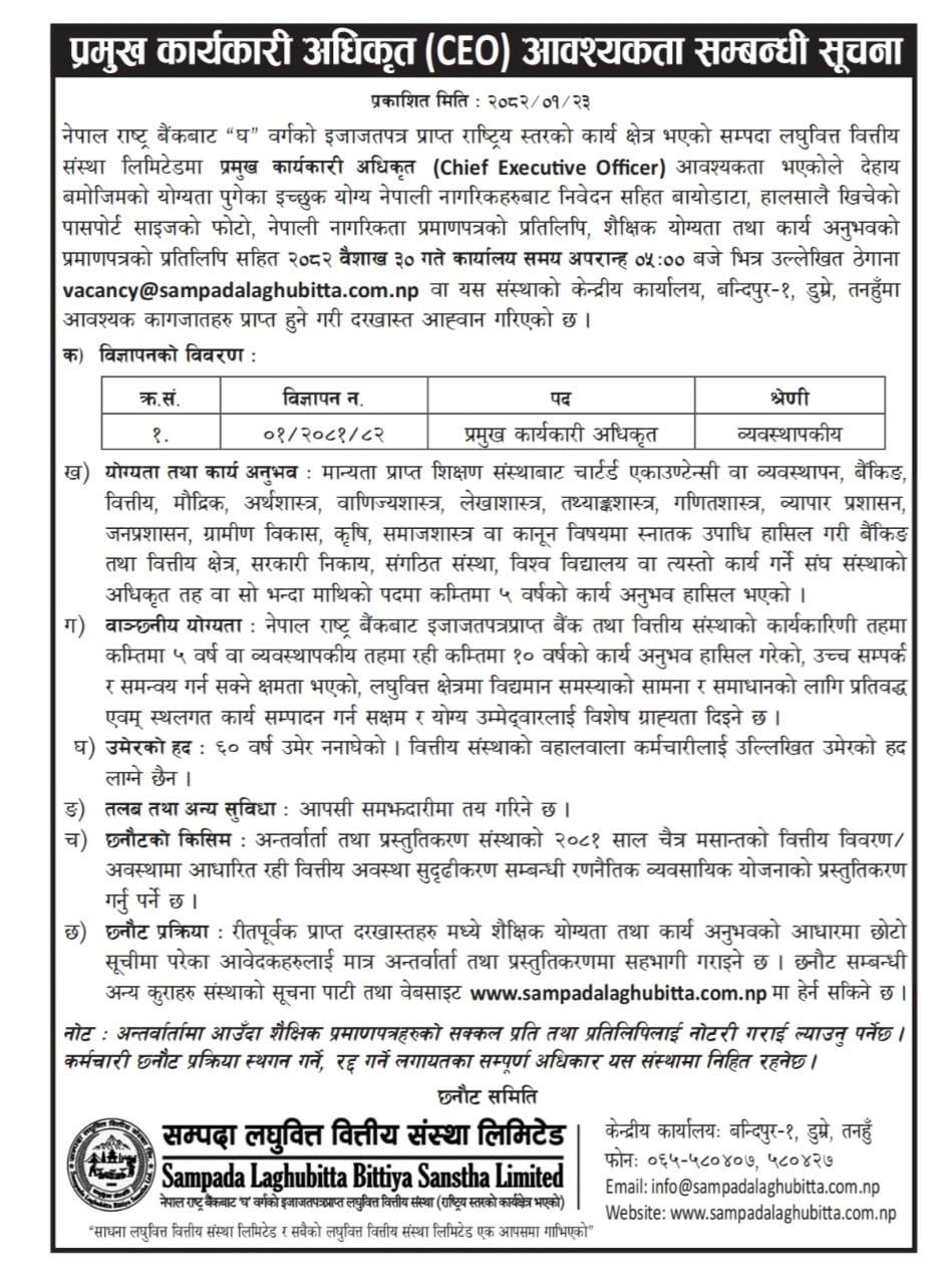 सम्पदा लघुवित्तमा सीईओ बन्न इच्छुक उम्मेद्वारले आवश्यक कागजात संकलन गरी बैशाख ३० गतेसम्म संस्थाको केन्द्रिय कार्यालय, बन्दिपुर–१, डुम्रे, तनहुमा तथा संस्थाको इमेल मार्फत आवेदन दिनुपर्ने छ ।