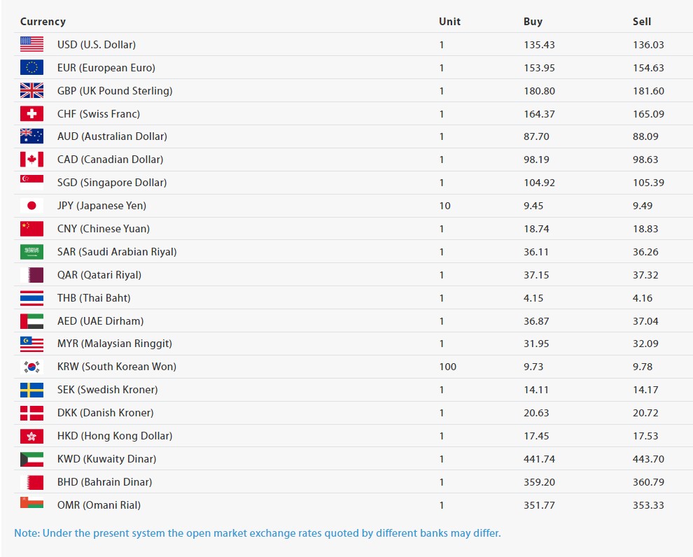 जापानी येन १० को खरीददर ९ रुपैयाँ ४५ पैसा र बिक्रीदर ९ रुपैयाँ ४९ पैसा, चिनियाँ युआन एकको खरीददर १८ रुपैयाँ ७४ पैसा र बिक्रीदर १८ रुपैयाँ ८३ पैसा, साउदी रियाल एकको खरीददर ३६ रुपैयाँ ११ पैसा र बिक्रीदर ३६ रुपैयाँ २६ पैसा र कतारी रियाल एकको खरीददर ३७ रुपैयाँ १५ पैसा र बिक्रीदर ३७ रुपैयाँ ३२ पैसा कायम भएको छ।