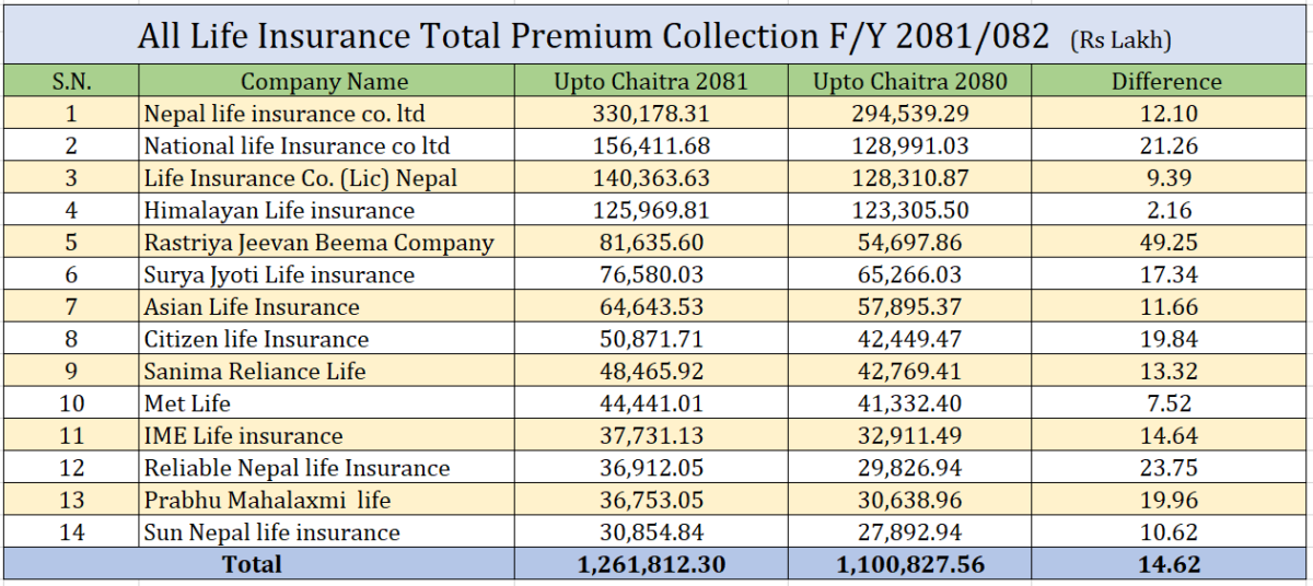 निर्जीवन बीमाको तुलनामा जीवन बीमा कम्पनीहरूको व्यवसाय वृद्धिदर दोब्बरले बढी छ । चालू वर्षको चैतसम्ममा १४ ओटा जीवन बीमा कम्पनीले १ करोड ३५ लाख ३९ हजार ५१० बीमालेख विक्री तथा नवीकरणबाट १ खर्ब २६ अर्ब १८ करोड १२ लाख रुपैयाँ कुल बीमाशुल्क आर्जन गरेका छन् ।