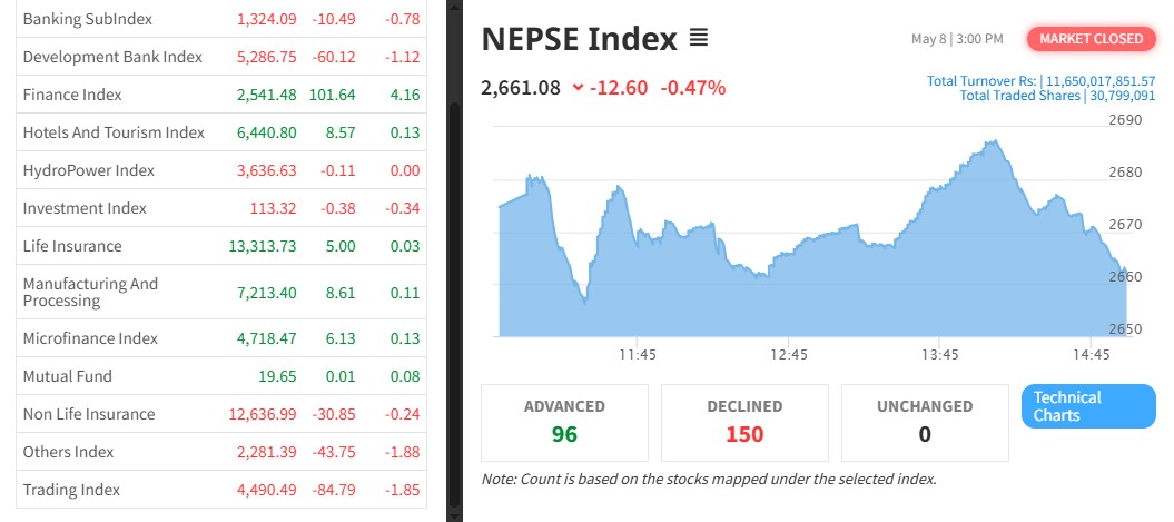 नेपाल स्टक एक्सचेञ्ज (नेप्से) १२.६० अकंले घटेर २६६१.०८ बिन्दूमा कायम भएको छ । आज ३१५ कम्पनीको ३ करोड ७ लाख ९९ हजार कित्ता शेयर किनबेच भएको हो । कारोबार रकममा भने यसदिन दिन रौनक आएको छ । बिहिबार ११ अर्ब ६५ करोडको शेयर कारोबार भएको हो ।