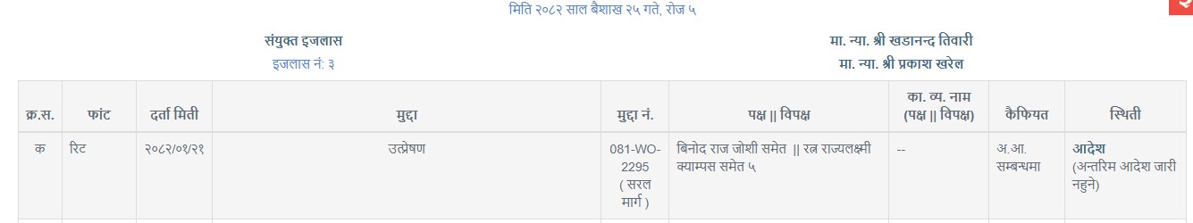 काठमाडौं । काठमाडौंको प्रदर्शनीमार्गस्थित रत्नराज्यलक्ष्मी (आरआर) क्याम्पसमा सहमतिमै गठन गरिएको स्वतन्त्र विद्यार्थी युनियन (स्ववियु) समिति विरुद्ध परेको रिटमा उच्च अदालत पाटनले अन्तरिम आदेश दिन अस्वीकार गरेको छ ।