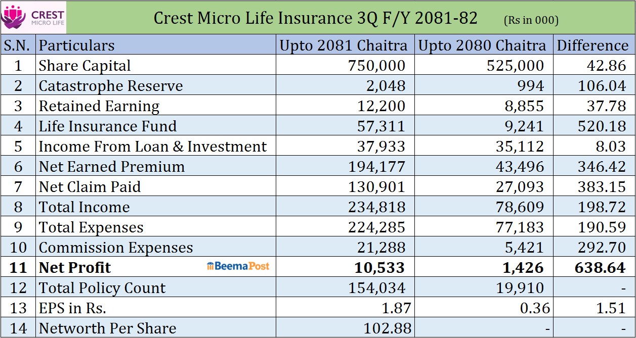क्रेस्ट माइक्रो लाइफको नाफा ६३८ प्रतिशत बढ्यो, जीवन बीमा कोष ५ करोड ७३ लाख