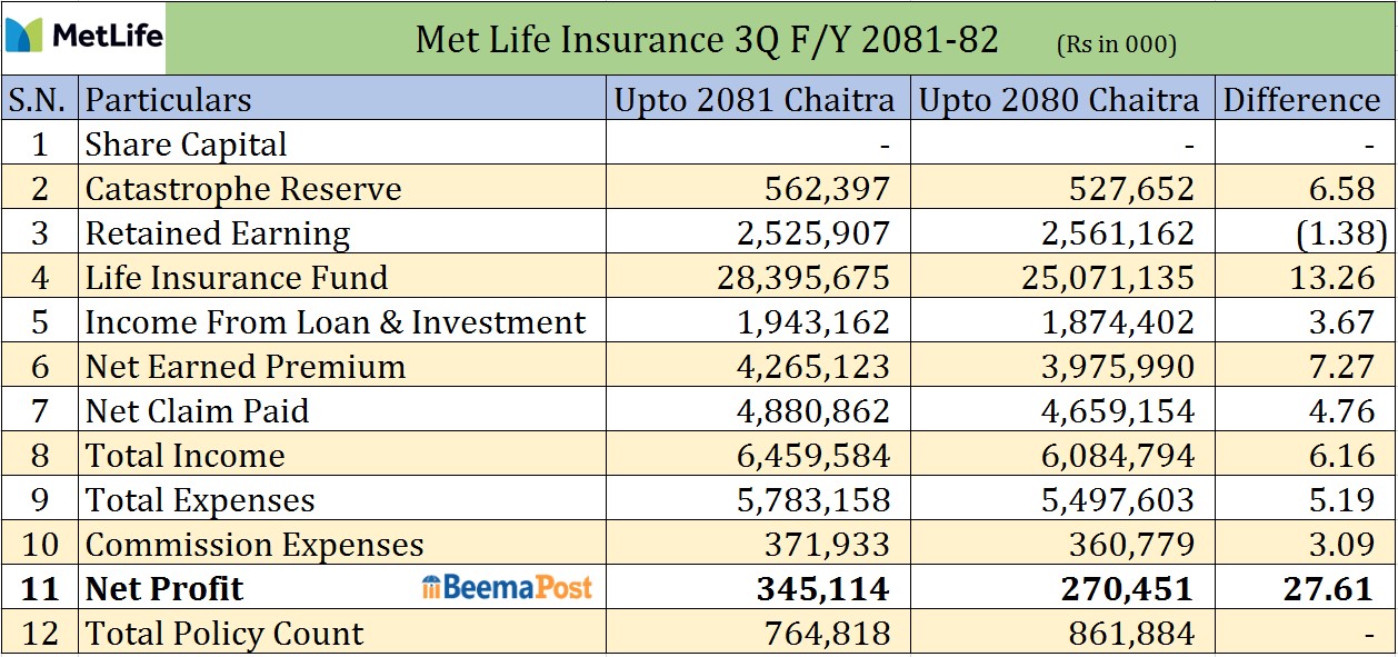 मेट लाइफको नाफा २७ प्रतिशत बढ्यो, जीवन बीमा कोष २८ अर्ब ३९ करोड