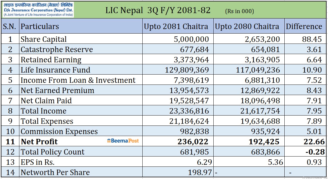एलआइसी नेपालको खुद बीमा शुल्क आर्जन ८.४३ प्रतिशतले बृद्धि भएर १३ अर्ब ९५ करोड ४५ लाख रुपैयाँ पुगेको छ । कम्पनीले गत आवको सोही अवधिमा १२ अर्ब ८६ करोड ९२ लाख रुपैयाँको बीमा शुल्क आर्जन गरेको थियो ।