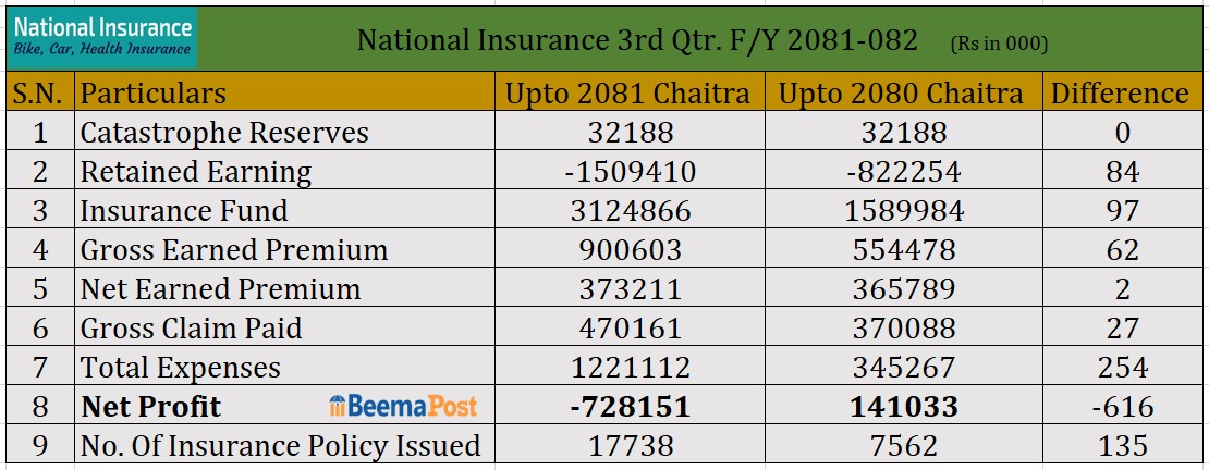 काठमाडौं । नेशनल इन्स्योरेन्स कम्पनी लिमिटेडले चालु आर्थिक वर्षको तेस्रो त्रैमासिक वित्तीय विवरण सार्वजनिक गरेको छ । कम्पनीले प्रकाशित गरेको विवरण अनुसार वित्तीय सूचांकको अवस्था दयनीय बन्न पुगेको छ ।