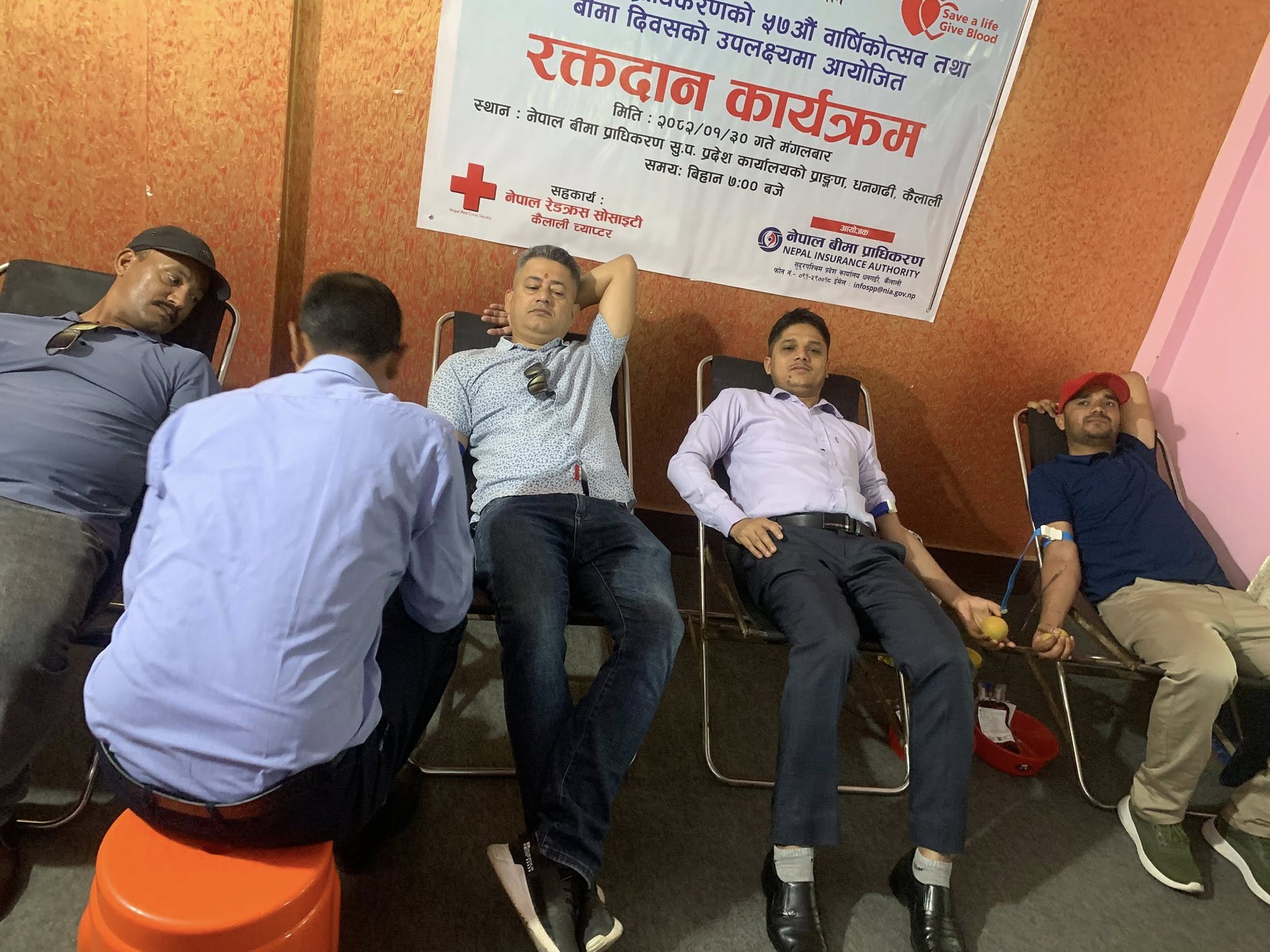 नेपाल रेडक्रस सोसाइटी, प्रादेशिक रक्तसंचार सेवा केन्द्र, धनगढीसँगको सहकार्यमा सम्पन्न उक्त कार्यक्रममा बीमक, बीमा अभिकर्ता, सर्भेयर तथा नेपाल बीमा प्राधिकरणका कर्मचारीहरूको उल्लेखनीय उपस्थिति रह्यो।