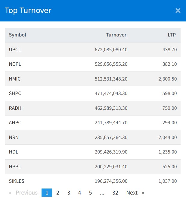 मंगलबार युनिभर्सल पावर कम्पनीको ६७ करोड २० लाख रुपैयाँ, ङादी ग्रुप पावरको ५२ करोड ९० लाख रुपैयाँ, नेपाल माइक्रो इन्स्योरेन्सको ५१ करोड २५ लाख रुपैयाँ, सानिमा माइ हाइड्रोपावरको ४७ करोड १४ लाख रुपैयाँ कारोबार भएको छ ।