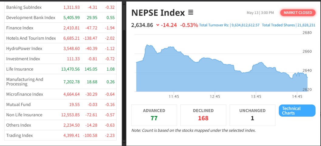नेपाल स्टक एक्सचेञ्ज (नेप्से) १४.२४ अकंले घटेर २६३४.८६ बिन्दुमा कायम भएको छ । आज ३१४ कम्पनीको २ करोड १८ लाख २८ हजार कित्ता शेयर किनबेच हुँदा ९ अर्ब ६३ करोड ४८ लाख रुपैयाँको कारोबार भएको छ ।