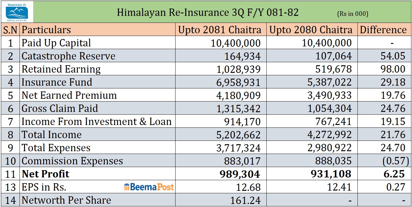 त्यस्तै गत वर्षको चैत मसान्तसम्म कम्पनीले ३ अर्ब ४९ करोड रूपैयाँ खुद बीमा शुल्क आर्जन गरेकोमा यस वर्ष १९.७६ प्रतिशतले बढेर ४ अर्ब १८ करोड रूपैयाँ नाघेको छ।