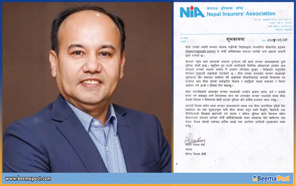 बीमा कम्पनीहरूले अनलाईन सञ्चार माध्यमको उपयोग द्वाबारा समय, अर्थ र श्रमको बचत गर्न सक्दछन् भन्ने विश्वासका साथ यस अनलाईन सञ्चार माध्यमले समग्र बीमा क्षेत्रको विकास र विस्तारमा खेल्दै आएको भूमिका प्रति हार्दिक धन्यवाद व्यक्त गर्दछु । आगामी दिनमा समेत यस्ता सञ्चार माध्यमहरूले ग्राहक तथा बीमा कम्पनीहरू दुवैको हित प्रवर्धनमा थप टेवा पुर्याउनुका साथै बीमा क्षेत्रमा घट्न सक्ने विकृति, विसंगती तथा बेथितिहरूको विरुद्धमा खबरदारी गर्न सशक्त र सक्रिय भूमिका खेल्ने विश्वास सहित बीमापोष्टले मनाउन लागेको पाँचौं बार्षिकोत्सवको पावन अवसरमा मेरो व्यक्तिगत तथा नेपाल बीमक संघको तर्फबाट हार्दिक बधाई तथा उत्तरोत्तर प्रगतिको शुभकामना व्यक्त गर्दछु ।