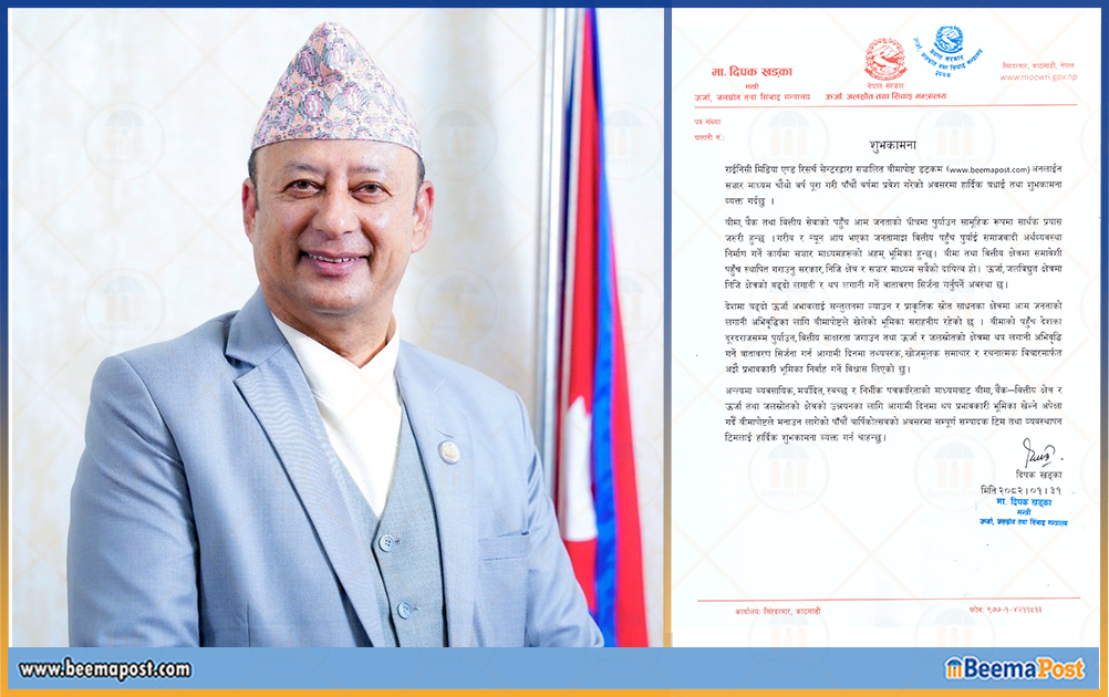 देशमा बढ्दो ऊर्जा अभावलाई सन्तुलनमा ल्याउन र प्राकृतिक स्रोत साधनका क्षेत्रमा आम जनताको लगानी अभिवृद्धिका लागि बीमापोष्टले खेलेको भूमिका सराहनीय रहेको छ । बीमाको पहुँच देशका दूरदराजसम्म पुर्याउन, वित्तीय साक्षरता जगाउन तथा ऊर्जा र जलस्रोतको क्षेत्रमा थप लगानी अभिवृद्धि गर्ने वातावरण सिर्जना गर्न आगामी दिनमा तथ्यपरक, खोजमूलक समाचार र रचनात्मक विचारमार्फत अझै प्रभावकारी भूमिका निर्वाह गर्ने विश्वास लिएको छु ।