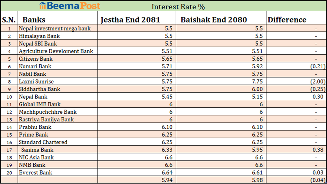 जेठ महिनामा व्यक्तिगत मुद्दति निक्षेपको औसत ब्याजदर ५.९४ प्रतिशतमा झरेको छ, जुन वैशाखमा ५.९८ प्रतिशत थियो। यसरी औसतमा ०.०४ प्रतिशत अंकको गिरावट आएको हो।