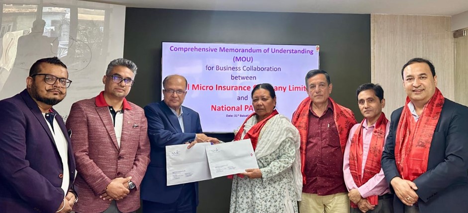 बीमा व्यवसायका विषयमा नेपाल माइक्रो इन्स्योरेन्स कं.लि. को प्रदेश कार्यालय, गैह्रिधारा, काठमाडैमा मिति २०८२।०१।३१ गतेका दिन आयोजित एक कार्यक्रमका बीचमा द्वीपक्षीय समझदारी पत्रमा हस्ताक्षर सम्पन्न भएको छ । उक्त समझदारी पत्रमा नेपाल माइक्रो इन्स्योरेन्स कम्पनी लि.को तर्फबाट प्रमुख कार्यकारी अधिकृत मृगेन्द्र रिमाल र नेशनल प्याव्सनका तर्फबाट सभापति गीता क्षेत्री राणाले हस्ताक्षर गरेका छन् । उक्त अवसरमा नेपाल माइक्रो इन्स्योरेन्स कं.लि. का नायव प्रमुख कार्यकारी अधिकृत श्री अनिल राज गिरी तथा नेशनल प्याव्सनका वरिष्ठ उपसभापति श्री सूर्य बहादुर अधिकारी लगायतको उपस्थिति रहको थियो ।