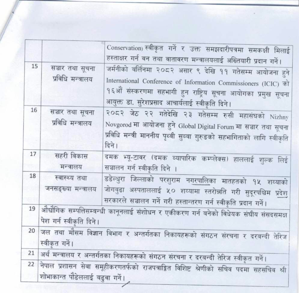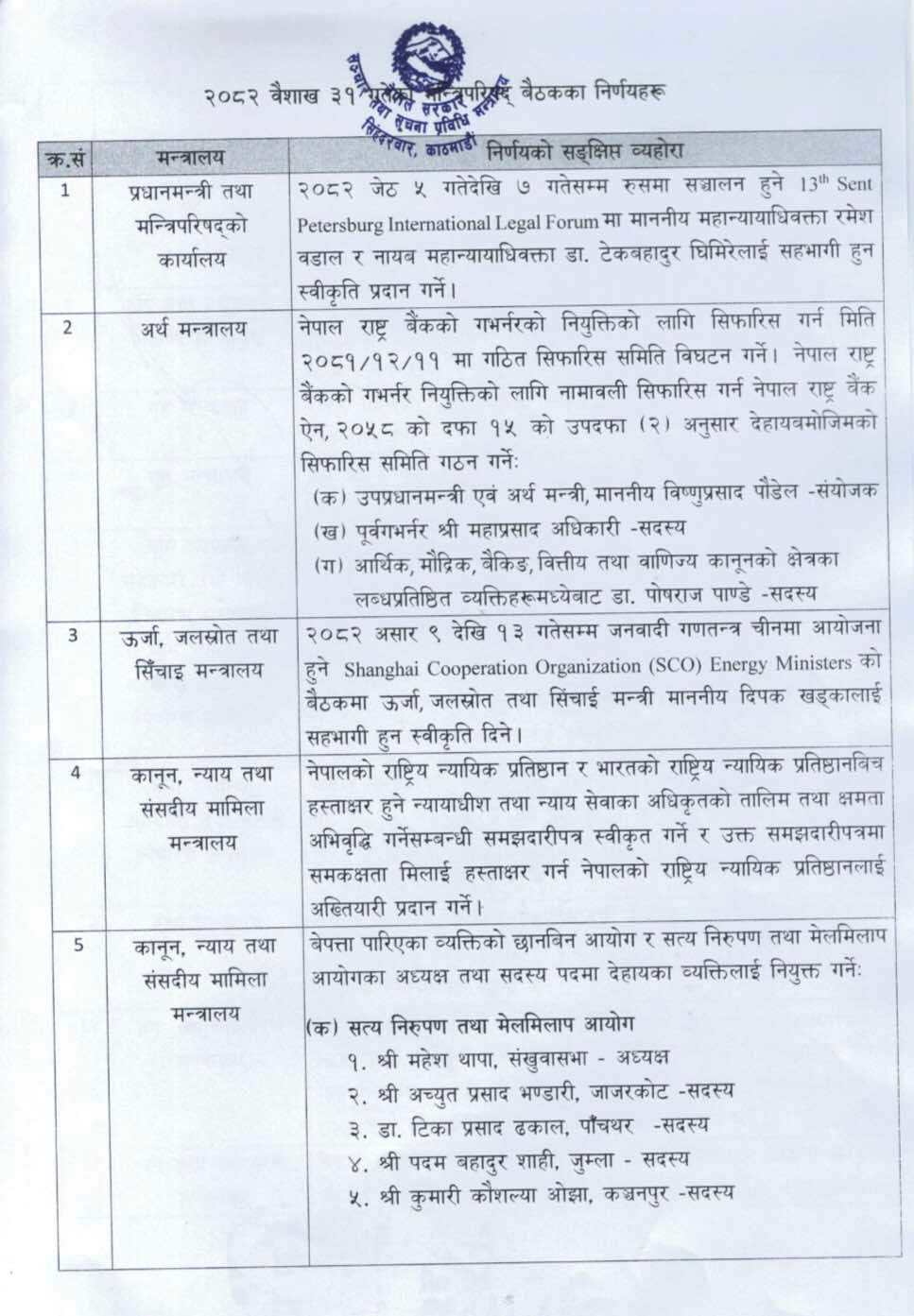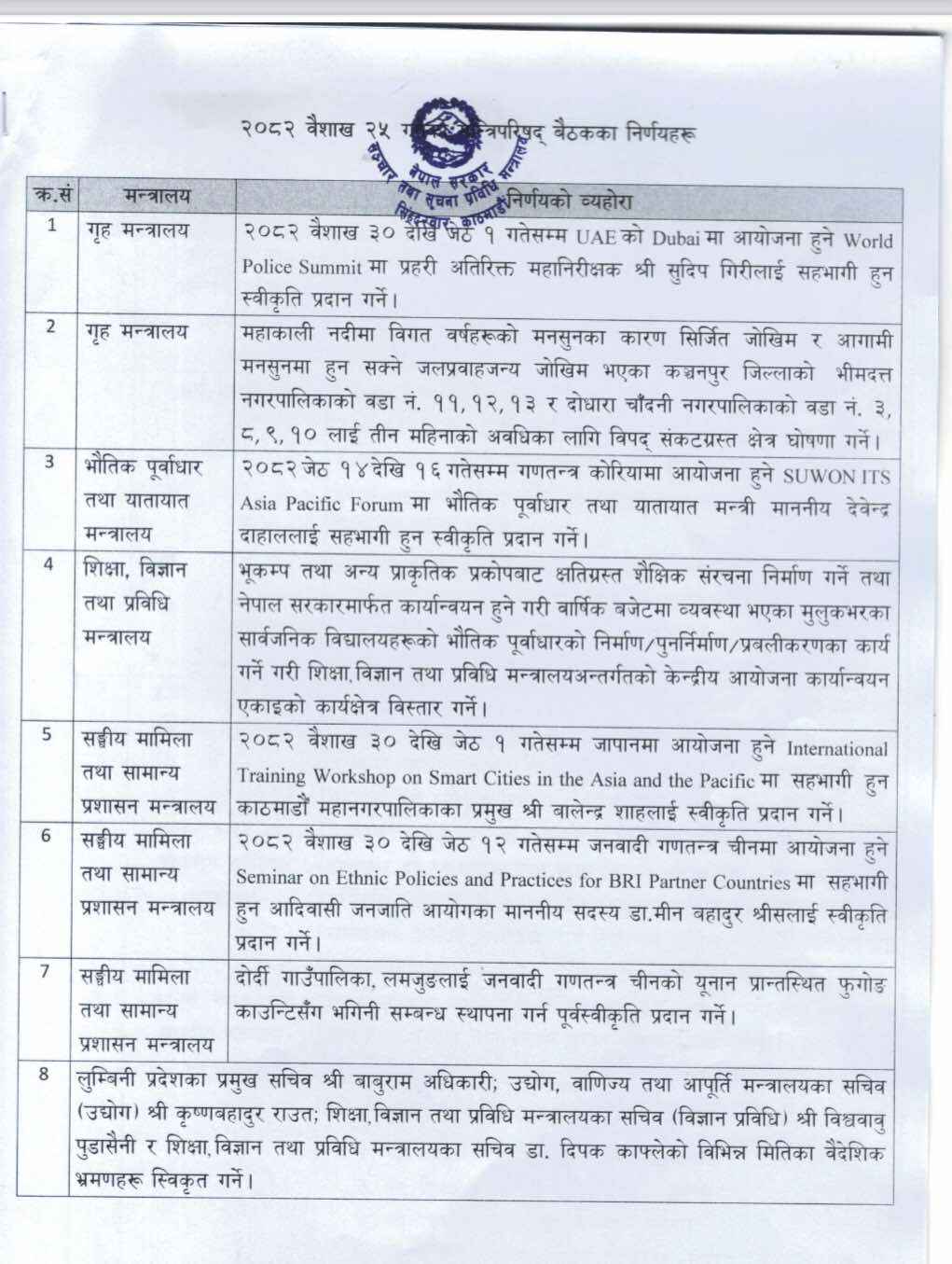 दुई वटा बैठकमा विभिन्न २२ वटा निर्णय भएका छन् । जसमा नेपाल प्रहरीका एआईजी सुदिप गिरीलाई दुवईमा आयोजना भएको (बैशाख ३१ देखि जेठ १ गतेसम्म) वर्ल्ड पुलिस समिटिमा भाग लिन स्विकृति दिनेदेखि उर्जामन्त्री दीपक खड्काको चीन भ्रमणको स्विकृतिसम्मका निर्णय समेटिएका छन्।