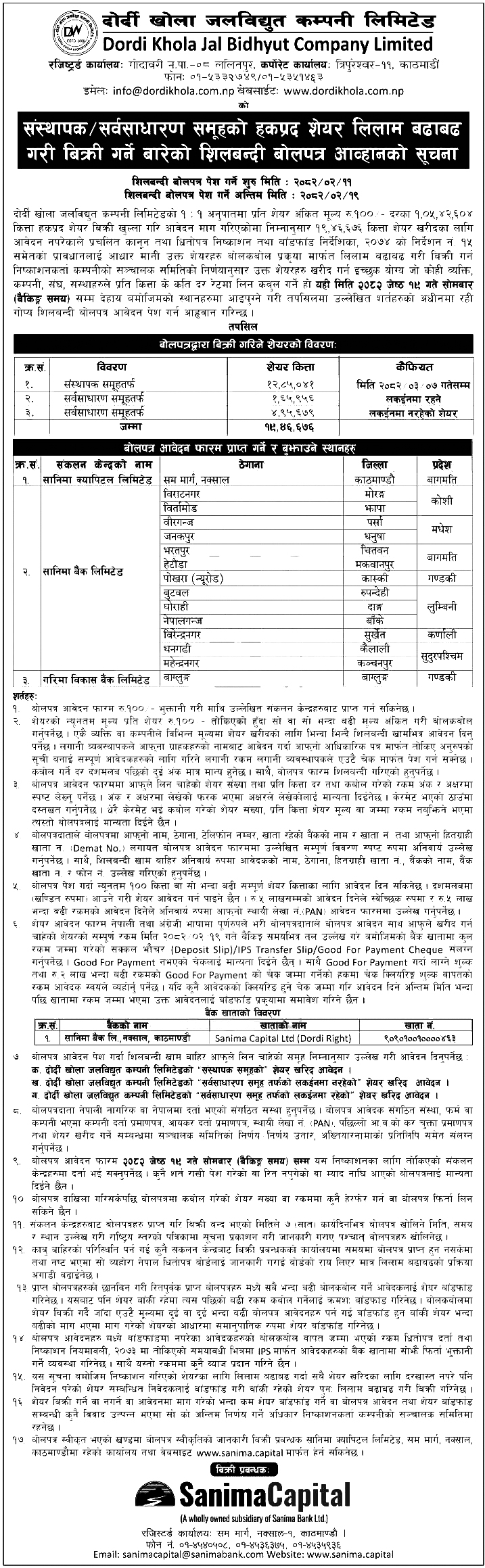 काठमाडौं । दोर्दी खोला जलविद्युत कम्पनी लिमिटेडले १९ लाख ४६ हजार ६७६ कित्ता अवितरित हकप्रद शेयर सबैले किन्न पाउने गरी लिलामीमा राखेको छ।