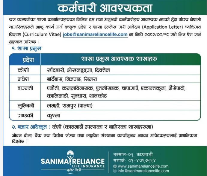 सानिमा रिलायन्स लाइफ इन्स्योरेन्सले देशभरी सञ्चालित १८ वटा शाखा कार्यालयको लागि शाखा प्रमुख र काठमाडौं उपत्यका र बाहिरका शाखा कार्यालयको लागि बजार अधिकृत पदमा केही कर्मचारी माग गरेको छ । सूचना अनुसार वित्तीय क्षेत्रमा काम गरेका अनुभवि उम्मेद्वारलाई बढी प्राथमिकता प्रदान गरिने छ ।