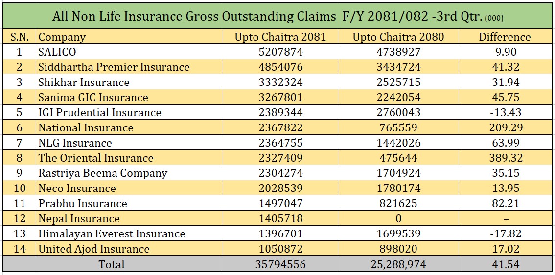 नेपालमा सञ्चालित रहेका १४ निर्जीवन बीमा कम्पनीहरुको बक्यौता बीमा दावी रकम गत आवको तुलनामा ४१.५४ प्रतिशतले बृद्धि भएको छ । कम्पनीहरुको गत आवको चैत मसान्तसम्मको अवधिमा ३५ अर्ब २८ करोड ८९ लाख रुपैयाँ रहेको थियो ।