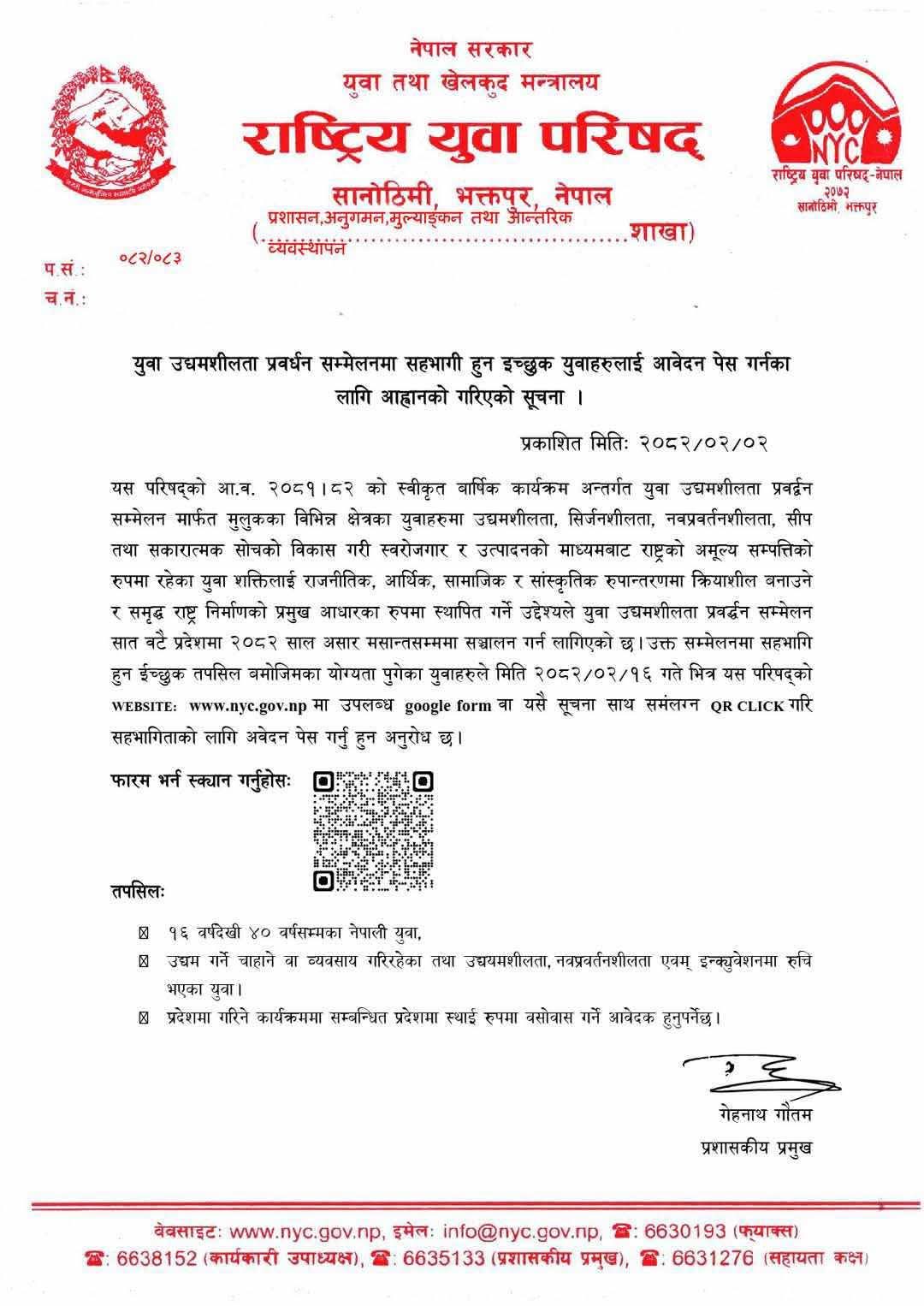 सम्मेलनमा सहभागी हुन चाहने युवाले २०८२ साल जेठ १६ गतेभित्र आवेदन दिनुपर्नेछ। आवेदन दिने प्रक्रियाको लागि परिषद्को वेबसाइट www.nyc.gov.np मा उपलब्ध गुगल फर्म भर्न सकिनेछ वा सूचनासँग समावेश गरिएको क्यूआर कोड स्क्यान गरी पनि आवेदन दिन सकिने परिषद्ले जनाएको छ।
