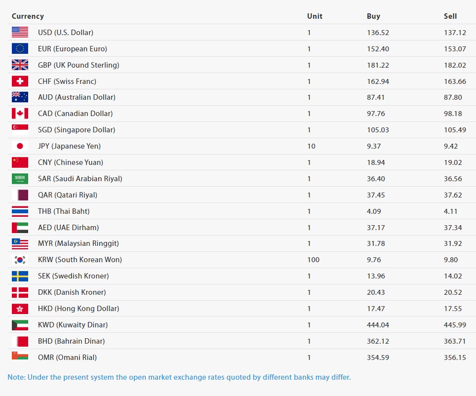 जापानी येन १० को खरीददर ९ रुपैयाँ ३७ पैसा र बिक्रीदर ९ रुपैयाँ ४२ पैसा, चिनियाँ युआन एकको खरीददर १८ रुपैयाँ ९४ पैसा र बिक्रीदर १९ रुपैयाँ ०२ पैसा, साउदी अरेबियन रियाल एकको खरीददर ३६ रुपैयाँ ४० पैसा र बिक्रीदर ३६ रुपैयाँ ५६ पैसा, कतारी रियाल एकको खरीददर ३७ रुपैयाँ ४५ पैसा र बिक्रीदर ३७ रुपैयाँ ६२ पैसा कायम भएको छ।