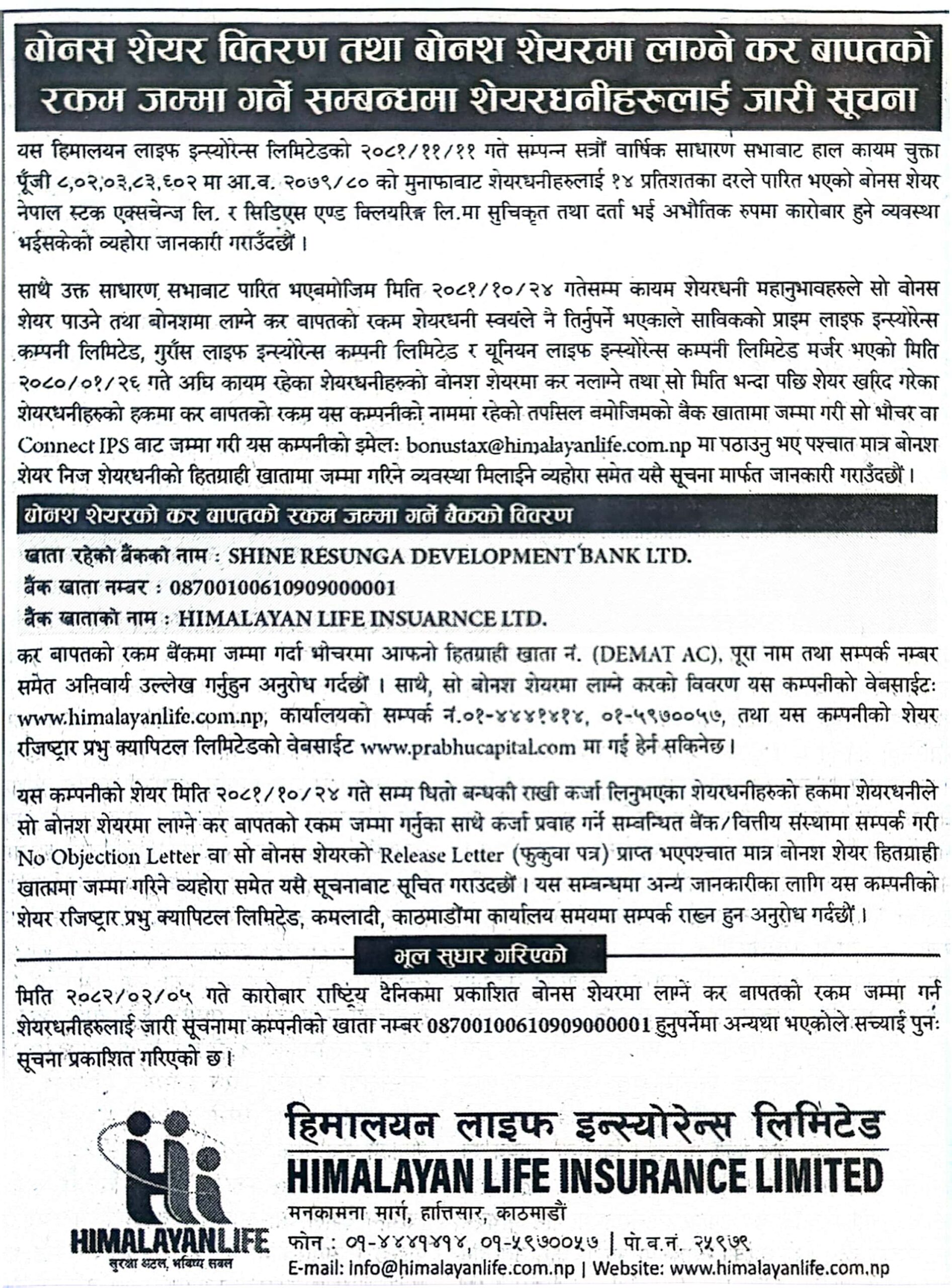 काठमाडौं । हिमालयन लाइफ इन्स्योरेन्स लिमिटेडले शेयरधनीहरूलाई बोनस शेयर बापतको कर तिर्न आग्रह गरेको छ।