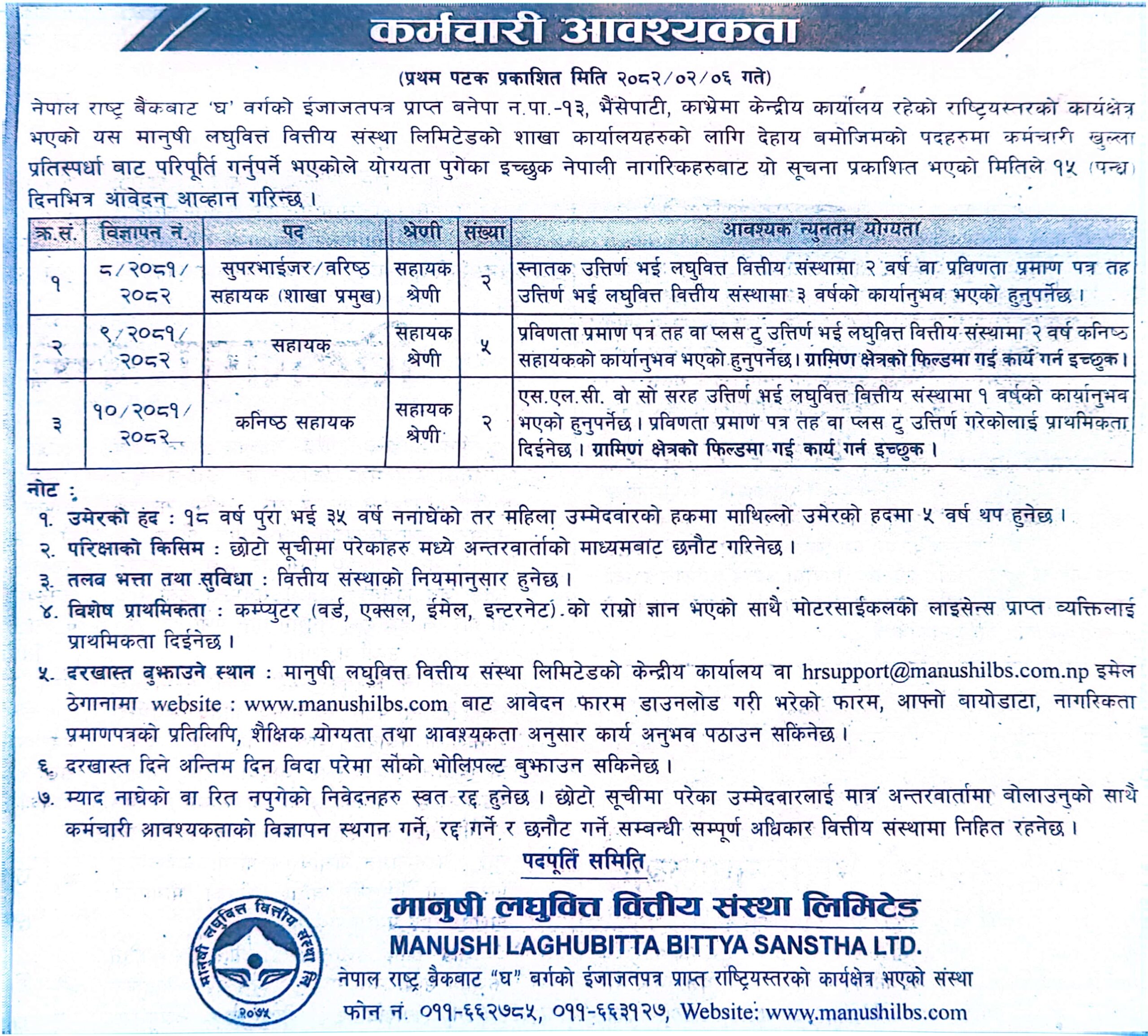 मानुषी लघुवित्तमा कर्मचारी माग, एसईई दिएकालाई पनि अवसर