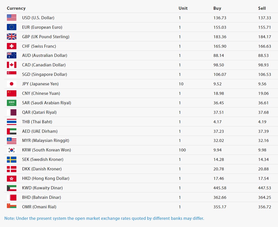 काठमाडौं । नेपाल राष्ट्र बैंकले आज जेठ ८ गतेका लागि विदेशी मुद्राको विनिमय दर सार्वजनिक गरेको छ। जसअनुसार अमेरिकी डलर एकको खरीददर १३६ रुपैयाँ ७३ पैसा र बिक्रीदर १३७ रुपैयाँ ३३ पैसा रहेको छ।