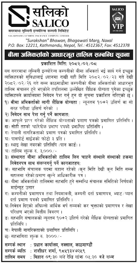 तालीम काठमाडौंको नक्सालस्थित कम्पनीको प्रधान कार्यालयमा बिहान साढे ९ बजेदेखि बेलुकी साढे ५ बजेसम्म चल्नेछ।
