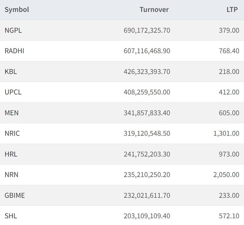 जसमध्ये ङादी ग्रुप पावरको सर्वाधिक ६९ करोड १ लाख रुपैयाँको दोस्रोमा राधी जलविद्युतको ६० करोड ७१ लाख रुपैयाँको र तेस्रोमा कुमारी बैंकको ४२ करोड ६३ लाख रुपैयाँको शेयर कारोबार भएको छ।